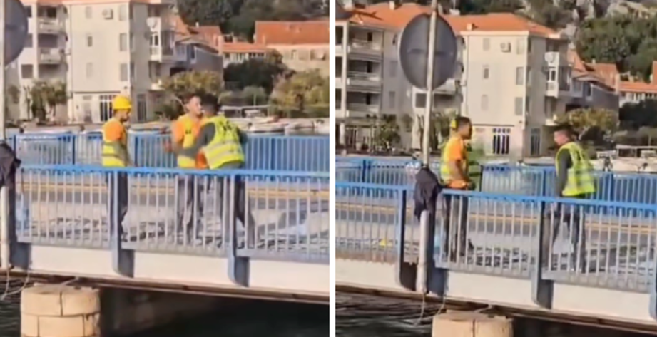 На видеото се гледа вербална и физичка пресметка меѓу двајца мажи во жолти елеци. Во еден момент, едниот од нив ја зема заштитната кацига и го удира другиот во главата. Присутен е и трет маж кој се обидува да ги раздели.