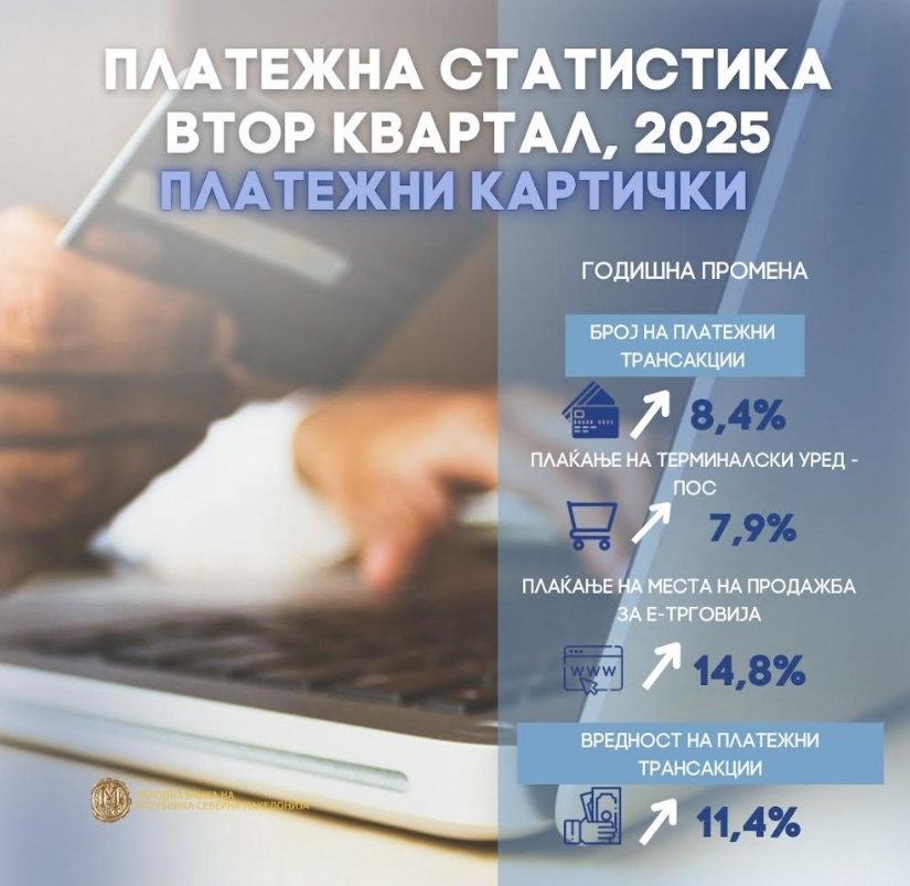 Се зголемува и користењето на платежните картички. Бројот на плаќањата со картички е поголем за 8,4%, а нивната вредност за 11,4%. Зголемувањето најмногу произлегува од зголеменото купување преку интернет (14,8%), но раст има и кај плаќањата во продавниците (7,9%).