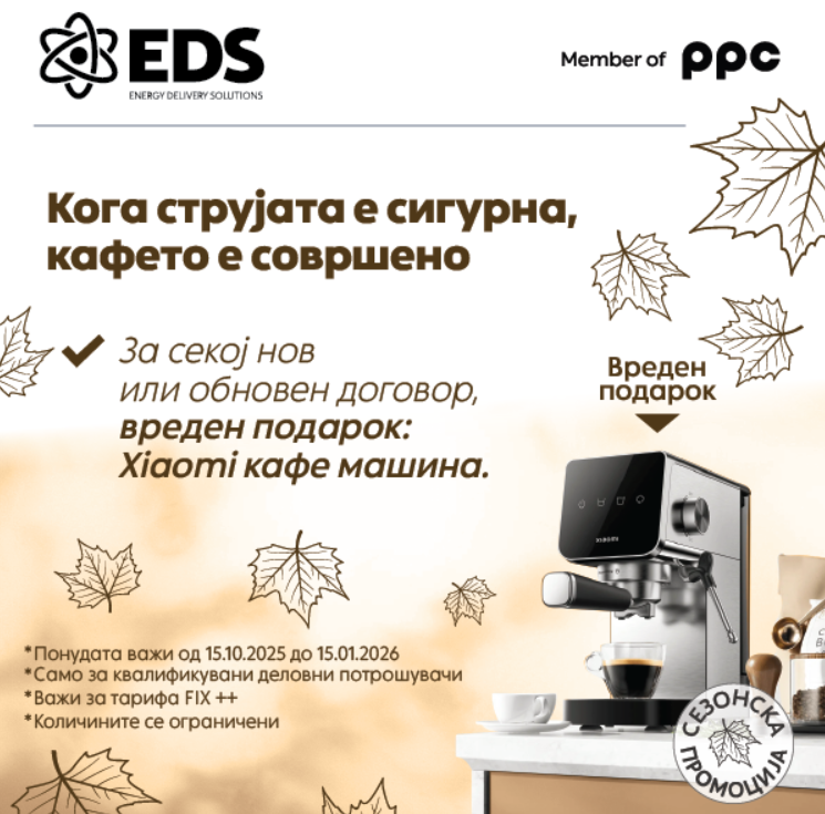 Со оваа промотивна кампања, ЕДС уште еднаш ја потврдува својата ориентација кон клиентите, нудејќи енергетски решенија што носат сигурност, стабилност и заштеда – и сега, со еспресо вкус на партнерството.