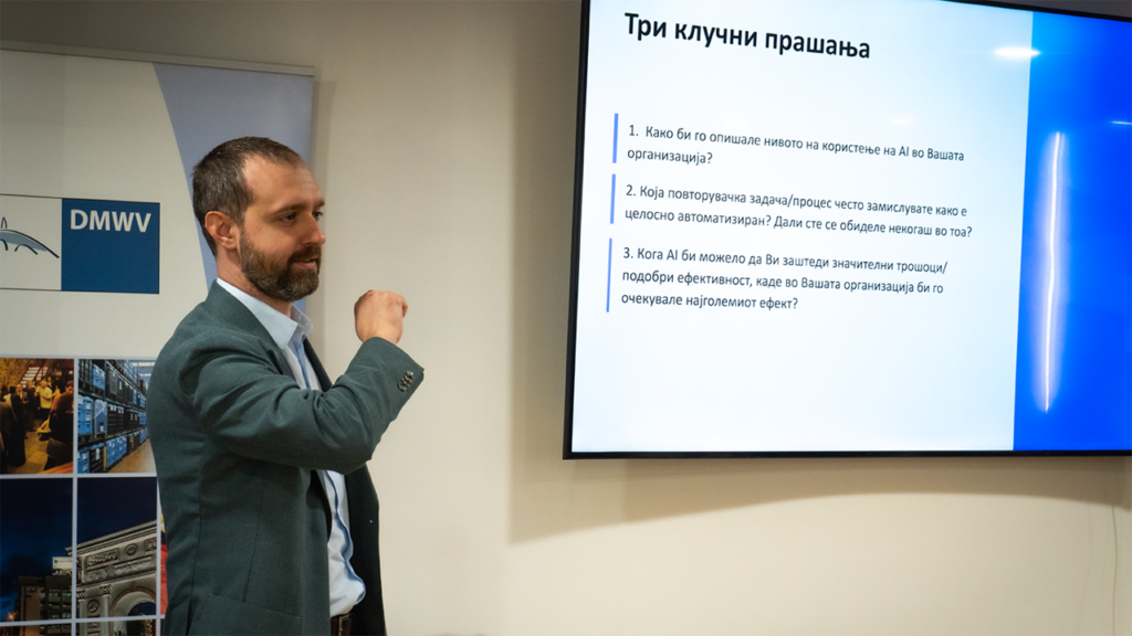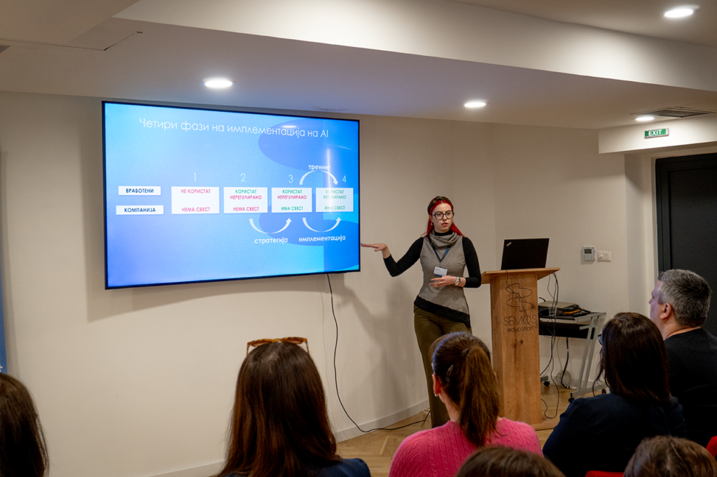Своите искуства и знаења со учесниците ги споделија Елена Димовска, раководител на секторот за анализа на податоци и АI во Семос Едукација, која се осврна на техничките предуслови и организациската подготвеност за AI имплементација, Кристина Тасева, специјалист за AI имплементација, која  презентираше конкретни насоки за проценка и поддршка на компаниите при имплементација на AI, како и Дане Тодоровски, тренер и бизнис консултант, кој ја истакна деловната перспектива и ефектите што компаниите можат да ги постигнат преку правилна и стратешка примена на вештачката интелигенција.