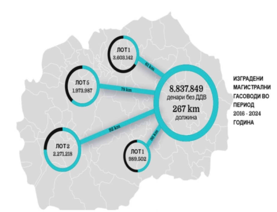 -Со ревизијата е утврдено дека најголем дел од инвестициите во тек се однесуваат на изградбата на трите магистрални гасоводи (ЛОТ 1 – 61 km, ЛОТ 1 – 36 km, ЛОТ 2 и ЛОТ 5 ). Овие инвестиции изнесуваат над 143 милиони евра  без ДДВ и иако се целосно изградени во периодот од 2016 до 2024 година. Причините за ваквата состојба се нерешени имотноправни односи при експропријација на земјиштето и пролонгирања кои потекнуваат од роковите за одобрување на измени во тек на градба во минатиот период, кое во исто време влијае сѐ уште да не се ставени во употреба, се заклучува во ревизијата.
